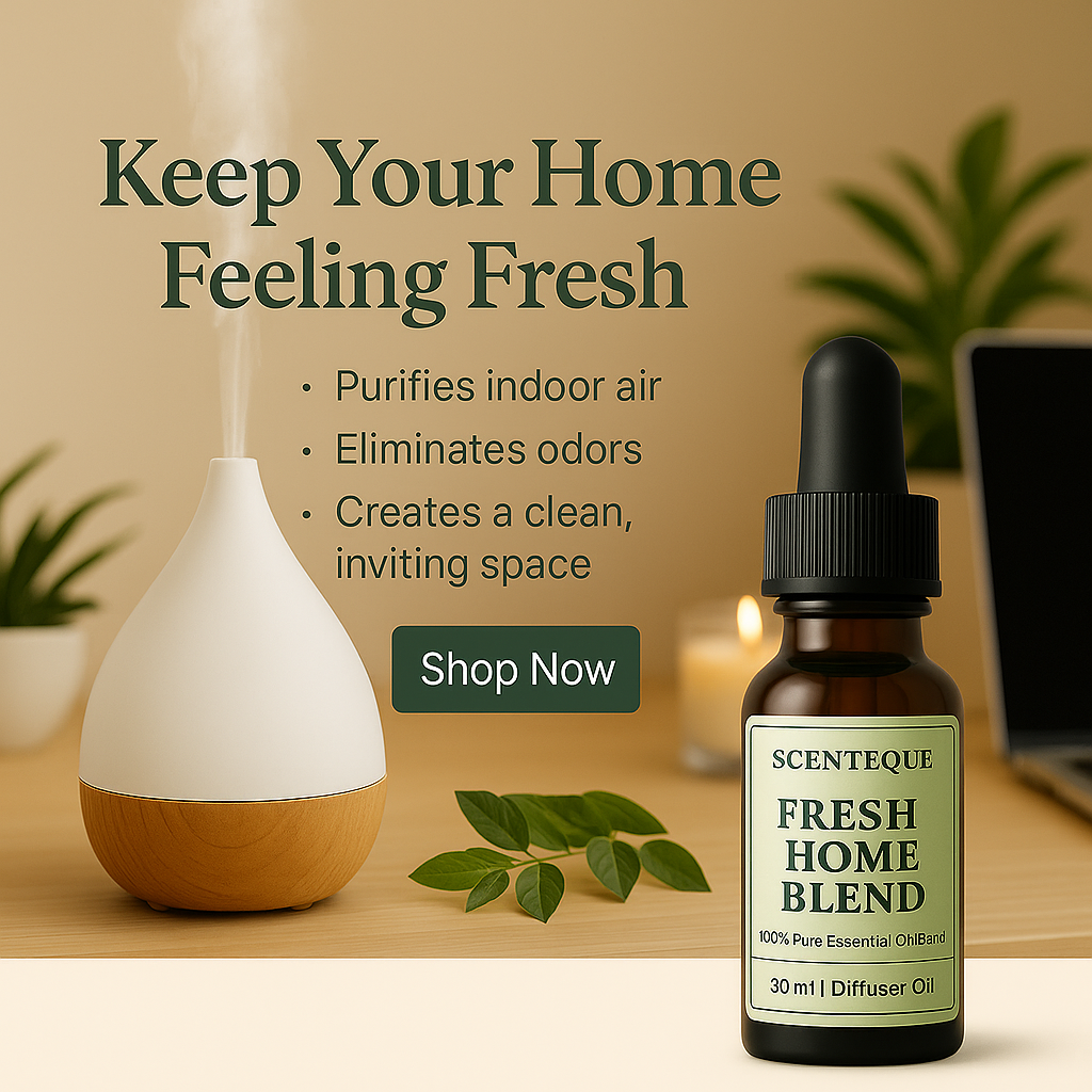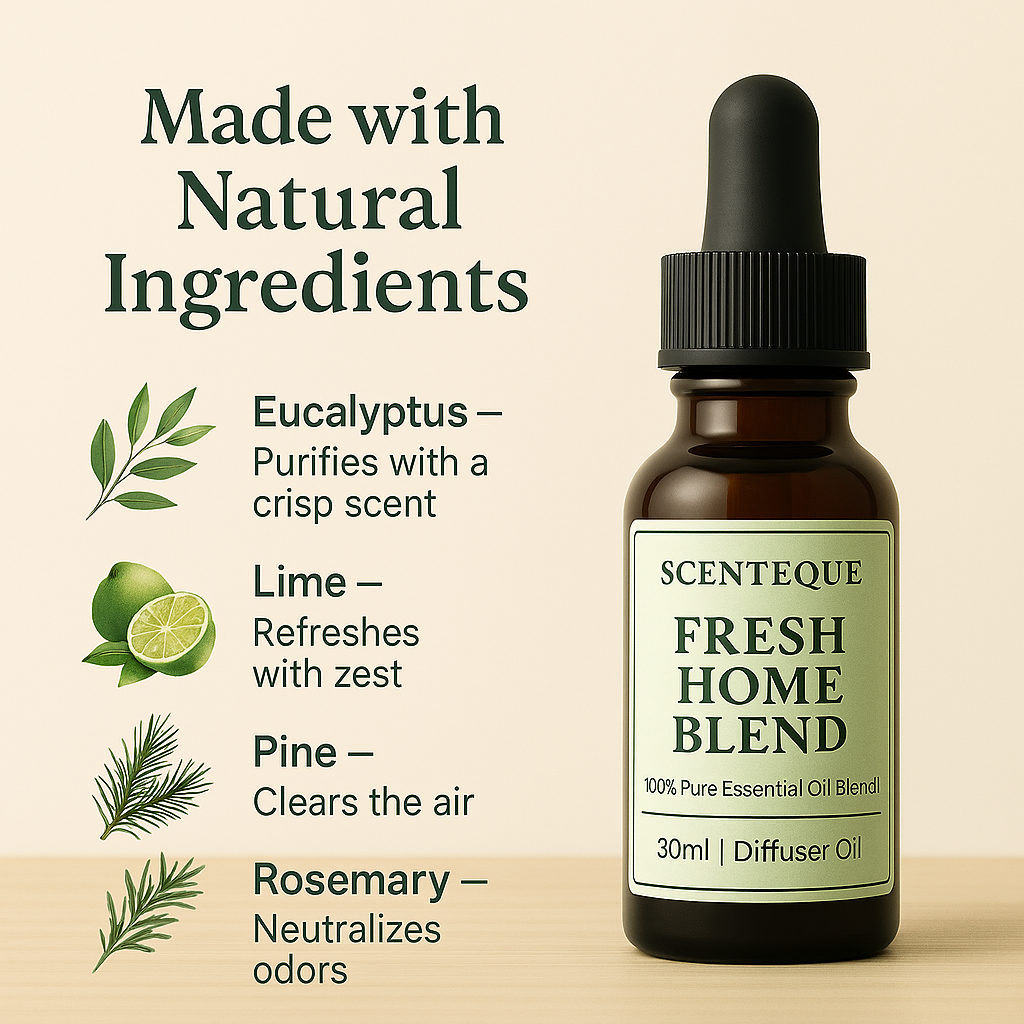 Transform your living space with Scenteque Fresh Home Blend, a refreshing essential oil blend made to purify the air, eliminate odors, and leave behind a light, natural scent. Perfect for diffusers, humidifiers, or home spa sessions.