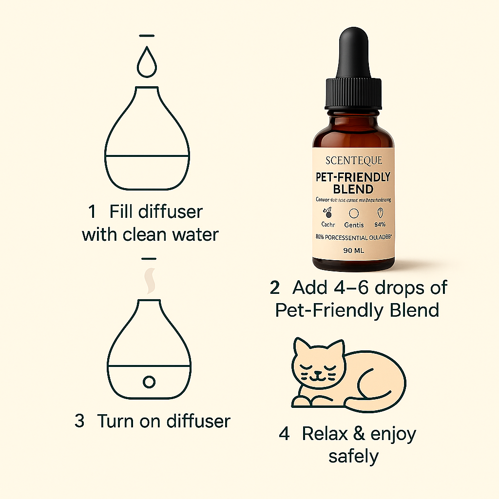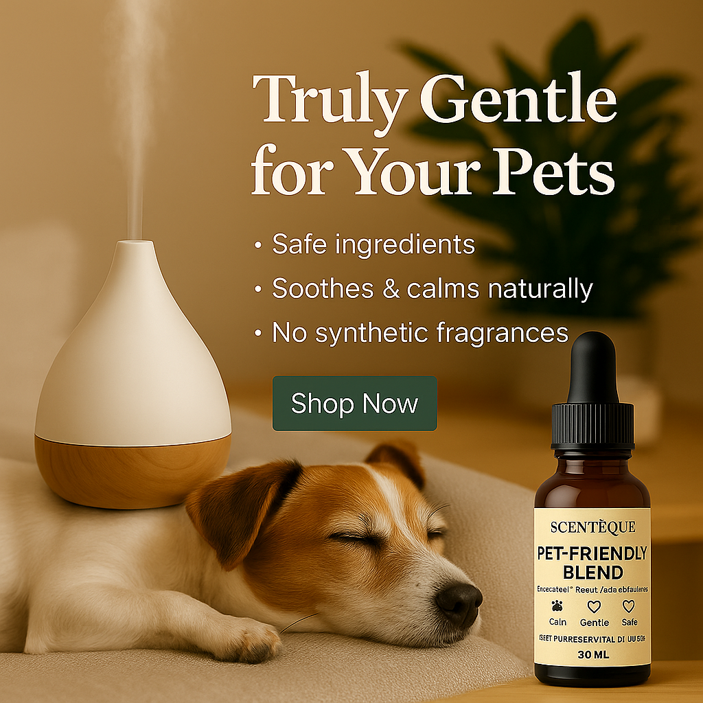 Scenteque Pet-Friendly Blend is made with 100% natural essential oils that are non-toxic and gentle — designed to neutralize odors, calm the environment, and keep the air clean while staying pet-safe.