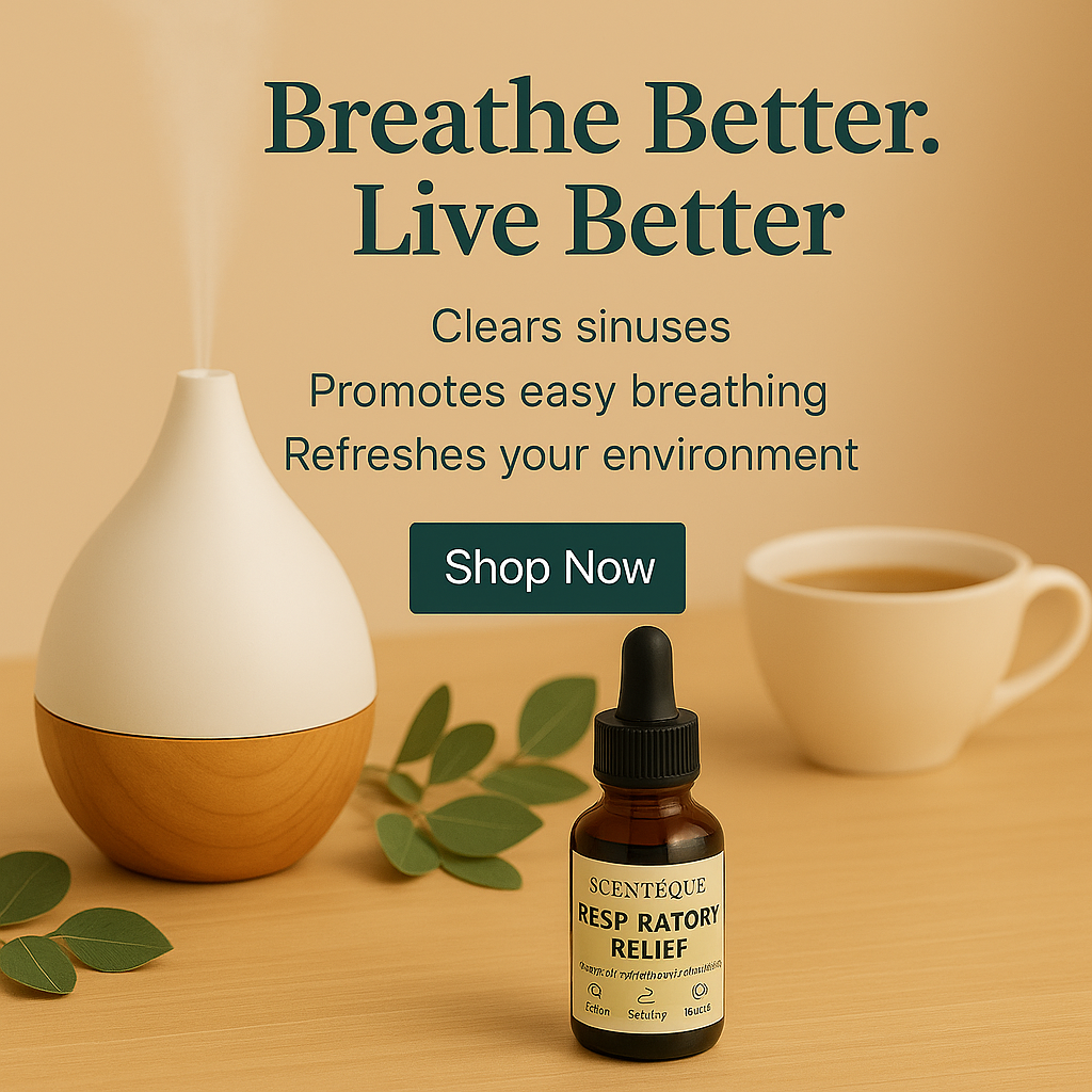 Find instant comfort and clarity with Scenteque Respiratory Relief, a 100% natural diffuser oil designed to open airways, soothe congestion, and support clear breathing.