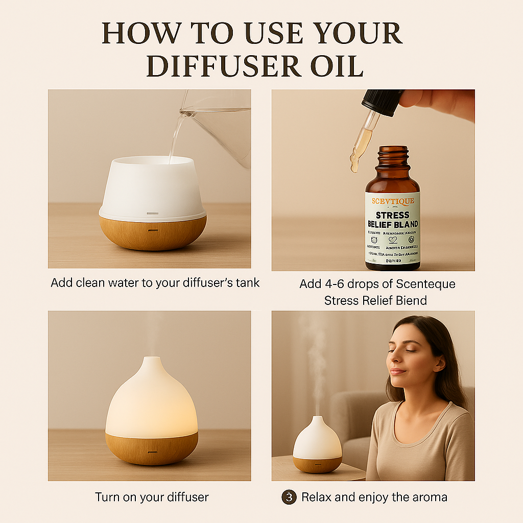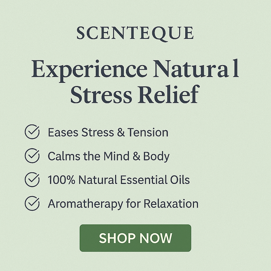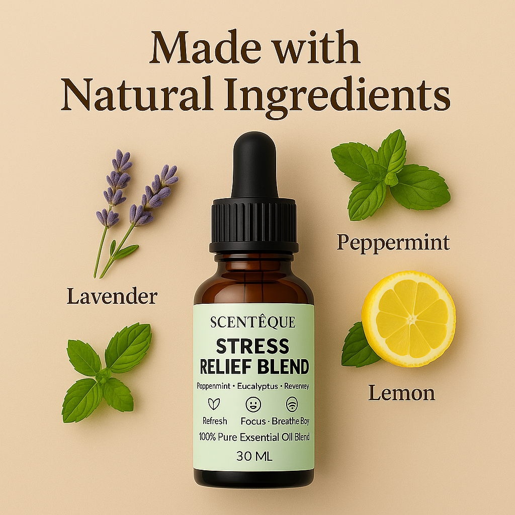 Find your calm with Scenteque Stress Relief Blend, a soothing diffuser oil designed to reduce tension, ease anxiety, and calm your mind after a long day.